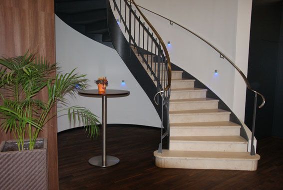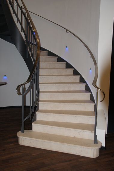 Wir planen für Sie Treppenanlagen für freitragende Bolzentreppen, plattierte Treppenstufen und untermauerte Treppen aus Betonwerkstein, Agglomarmor, Marmor und Granit.